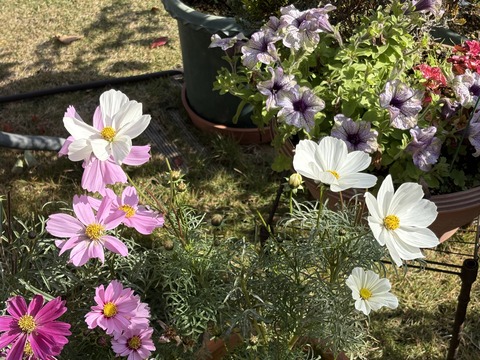 秋庭にうっとり?孔雀アスター&マリーゴールド、バラとの競演