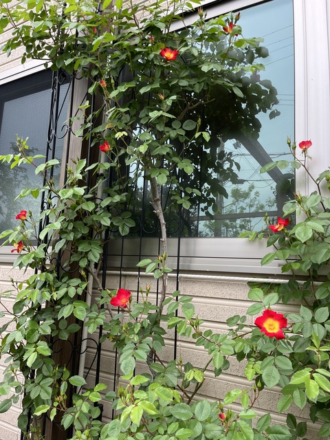 お早うございます(^^)/西庭外壁に這わせた?カクテル、早咲き品種一重なので、開花エネルギーも少なくて何と言ってもコスパが良い‼️あっという間に灯り···