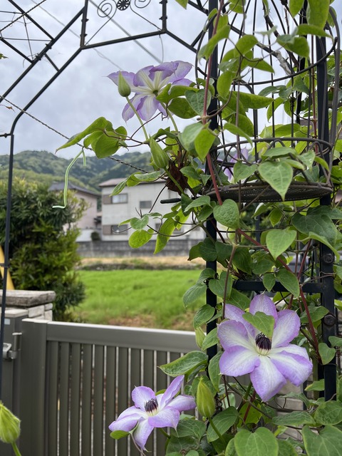 クレマチス パープレア プレナ エレガンス&白万重、宿根草ペンステモン&ラムズイヤー