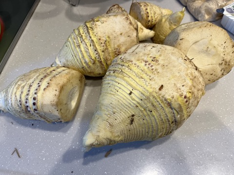 初物の筍、クレマチス白雪姫開花?は強風で散々